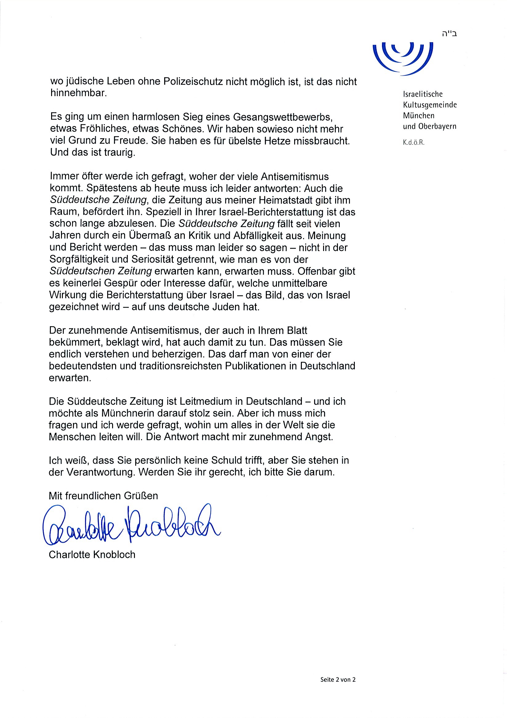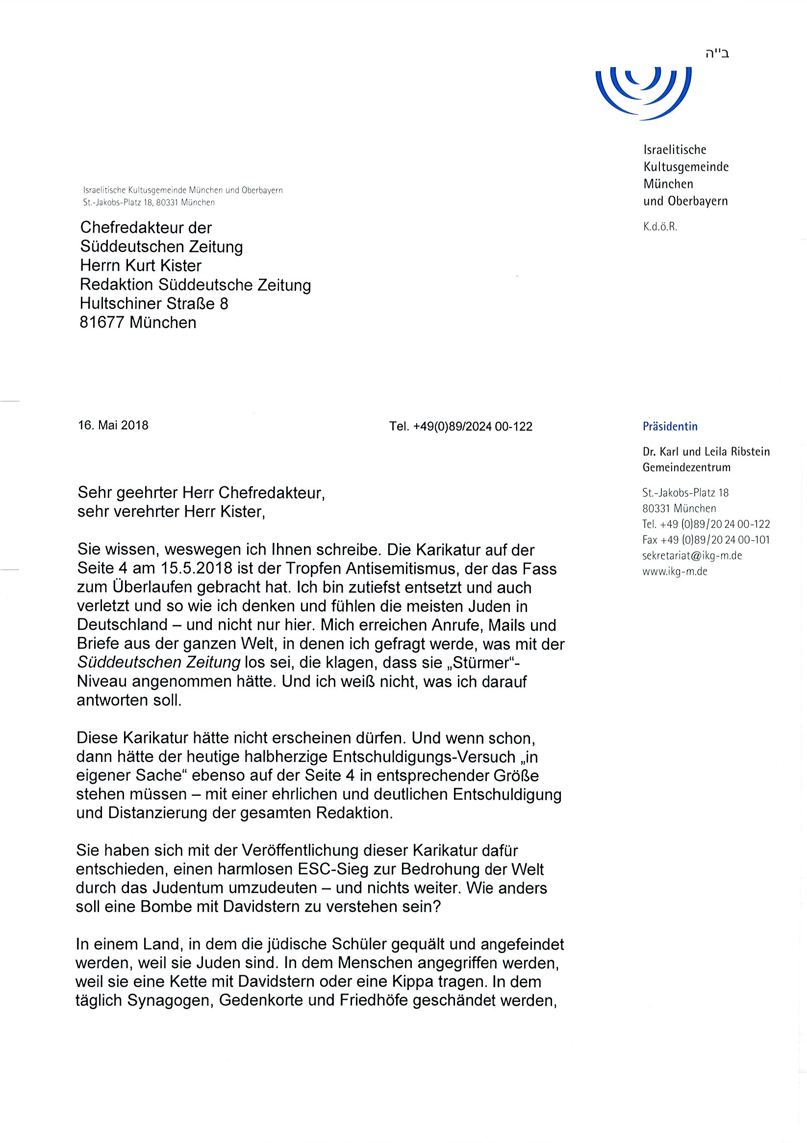 Knobloch kritisiert antisemitische Karikatur in der Süddeutschen Zeitung